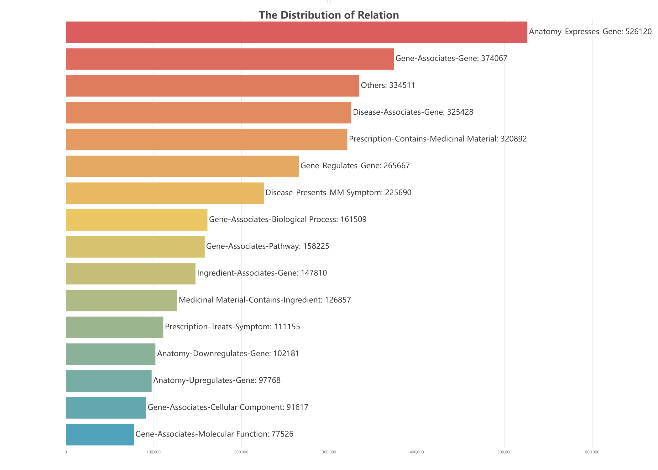 This database was constructed based on CMPCP, SymMap, TCMBANK, PrimeKG, and PharMeBINet. It contains 20 types of entities and 46 types of relationships, as shown in the distribution information below.